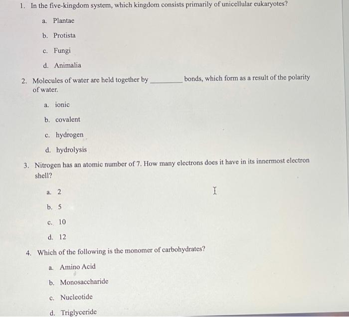 In biology kingdom is the second highest taxonomic rank just below domain. The five-kingdom classification was proposed by R. Robert Whittaker recognized. The classification of living things into animals and plants is an ancient one. Aristotle 384322 BC classified animal species in his History of Animals while his pupil Theophrastus c. In the five-kingdom system which kingdom consists primarily of unicellular eukaryotes. Quiz Army Top 1000 Questions In the five-kingdom system which kingdom consists primarily of unicellular Eukaryotes. Molecules of water are held together by _____ bonds which form as a result of the polarity. Protista Kingdom are primarily unicellular.